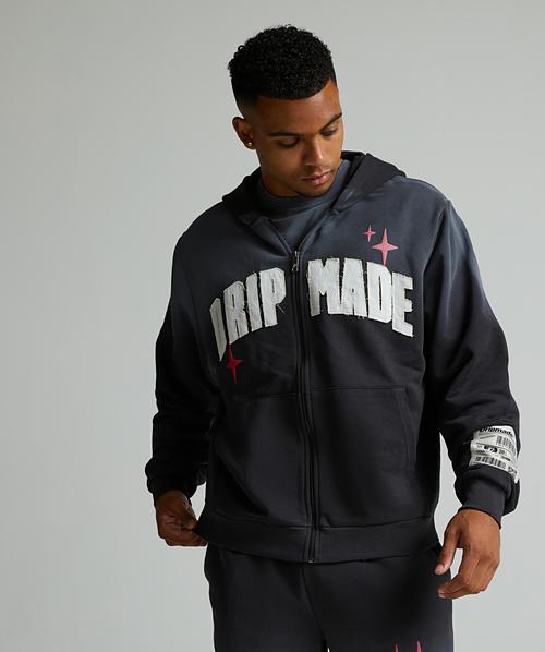 This full zip fastening hoodie is your ideal layering companion for trips out into the urban jungle. With a fixed hood, ribbed cuffs and hem, front pouch pockets, washed-style fabric and a series of large eye-catching embroidered and distressed Dripmade brandings and graphics to front, back and left cuff. Regular fit. This product is 64% Cotton and 36% Polyester (Exc. trims).
